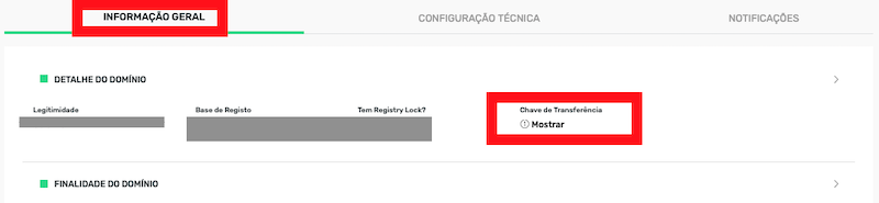 Para obter o código de transferência de um domínio.pt no