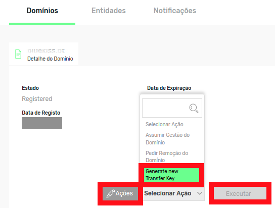 “Confirmar”. De seguida irá receber uma mensagem a informar que a chave de transferência do domínio foi atualizada.